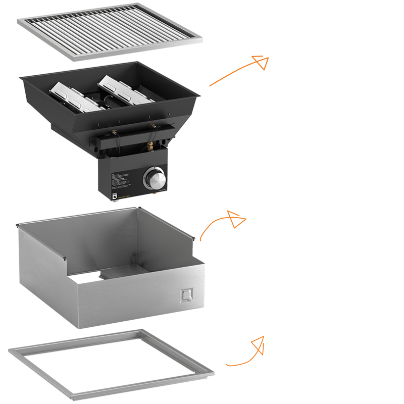 U maakt een standaard uitsparing van 41x41cm en vervolgens kunt u elke oneQ-functie in die opening plaatsen: een FLAME gasbarbecue, een GLOW houtskoolbarbecue, een WOK Brander, een ICE wijnkoeler, een WET spoelbak met kraan, een BAMBOE snijplank of een kleine kamado barbecue.