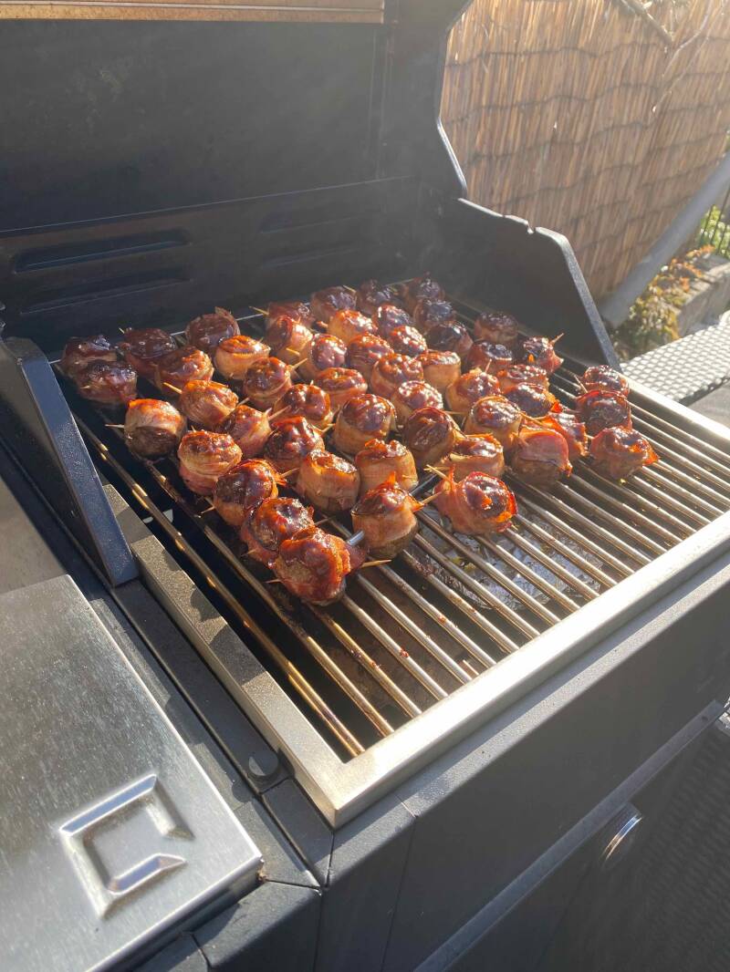 - Rol om ieder balletje een plakje bacon en zet vast met een cocktailprikker.